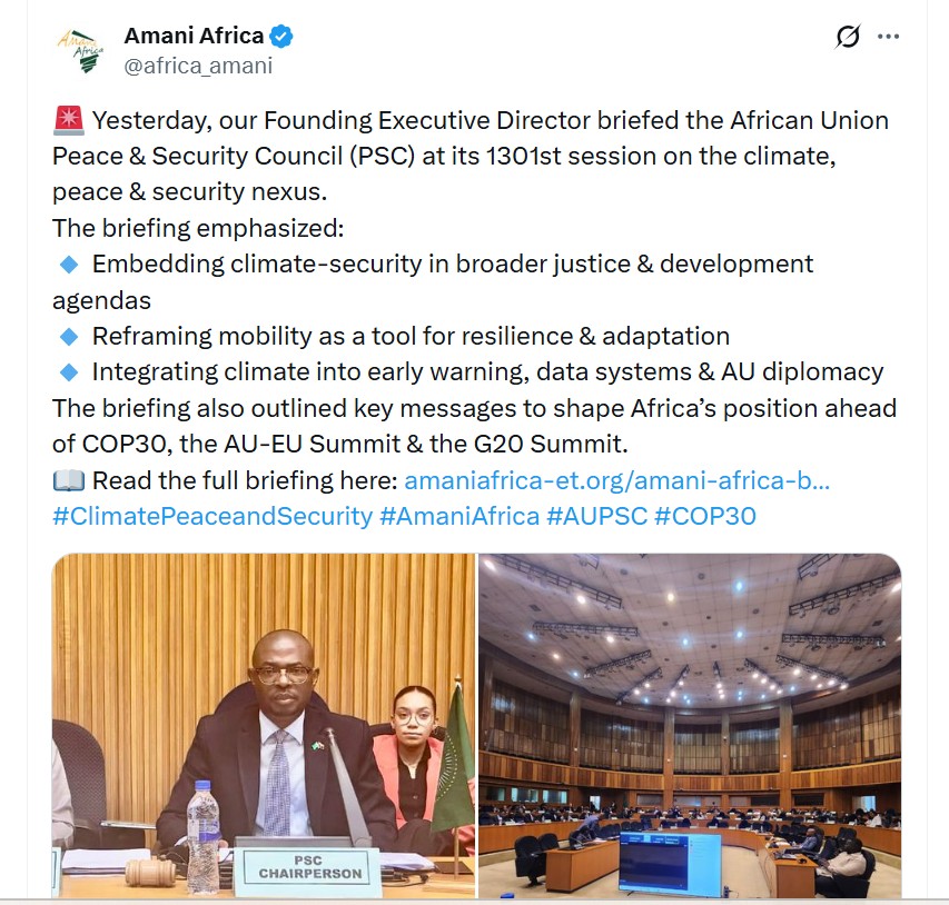 The key occasion for presenting a policy briefing to the AU policy organ was the session of the Peace and Security Council held on 17 September 2025, dedicated to climate change, peace and security.