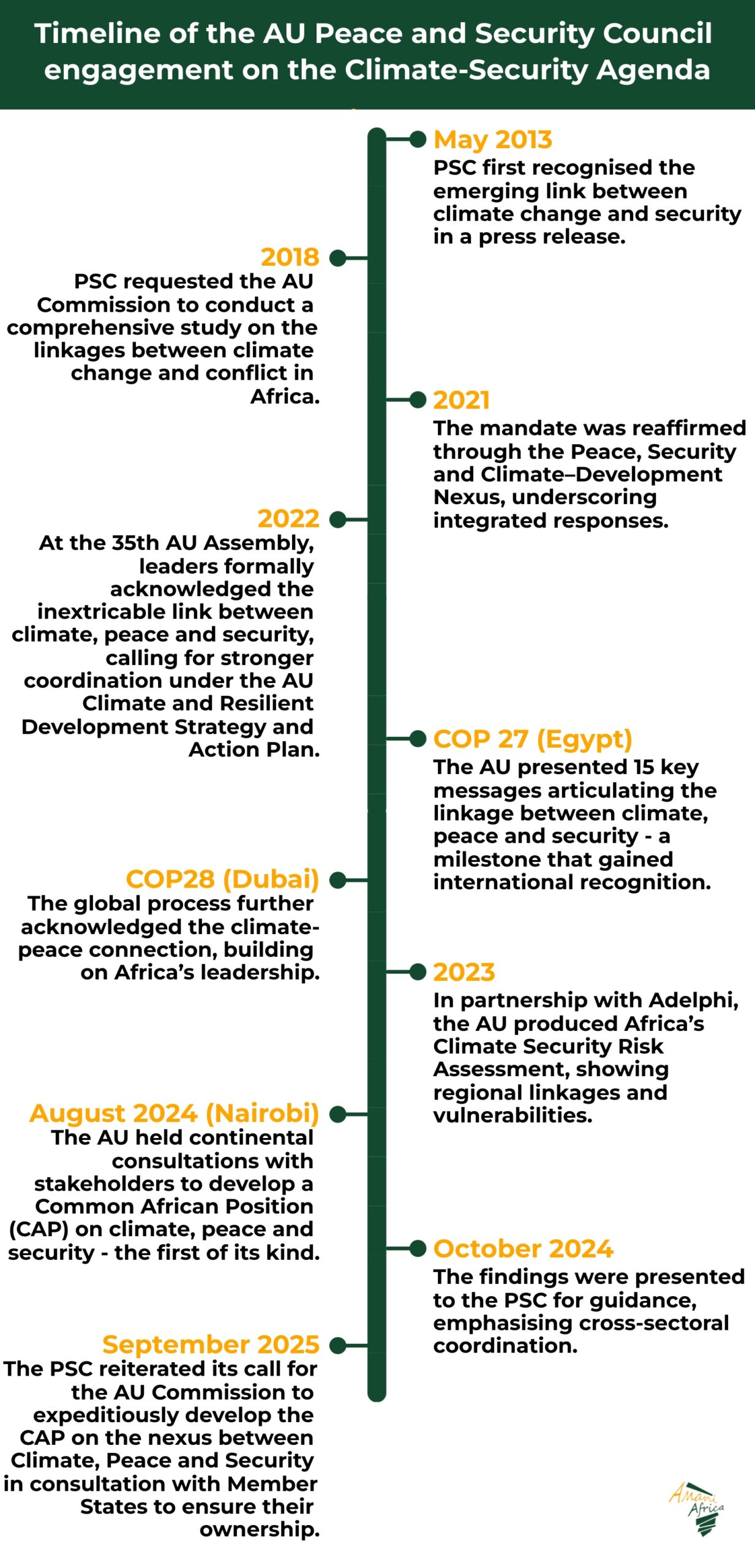 Tomorrow’s session is also expected to get an update on the work for the finalisation of the Common African Position (CAP) on Climate Change, Peace and Security. It is to be recalled that updates provided during the 1301st session indicated that the CAP is now expected to be concluded ahead of COP31, reflecting the need for input of member states, deeper consultation and alignment with existing AU frameworks, including the Africa Group of Negotiators. The delay also underscored ongoing political sensitivities, but it also highlights the strategic importance of ensuring Member State ownership and coherence across Africa’s climate and peace architectures. Since the last session and the update from Adoye, the draft CAP was presented at a technical meeting held in Nairobi, Kenya. The technical meeting held in Nairobi, Kenya on 25-27 November 2025 under the title “AU member States Validation Workshop on the Draft Common African Position on the Climate Change, peace and security nexus (CAP-CPS)’ concluded without validating the draft. The outcome statement outlined the five-step process roadmap to finalise the work.