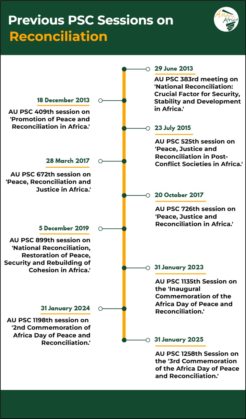 Since its inaugural meeting in 2023, the session has been traditionally held on 31 January of each year, following the declaration of the 16th Extraordinary Session of the AU Assembly on terrorism and unconstitutional changes of government in Africa held in May 2022 in Malabo, Equatorial Guinea, in which it decided to institutionalise the commemoration annually. During the last commemoration, the 3rd, held on 31 January 2025, the PSC called for the ‘domestication of the commemoration of the Africa Day of Peace and Reconciliation at Regional and national level…’ and highlighted the need for ‘the ‘Africa Day of Peace and Reconciliation’ to be aligned with efforts to advance the implementation of the AU Transitional Justice Policy, which provides a roadmap, ensuring that reconciliation is built on accountability, truth-telling, and social cohesion.’