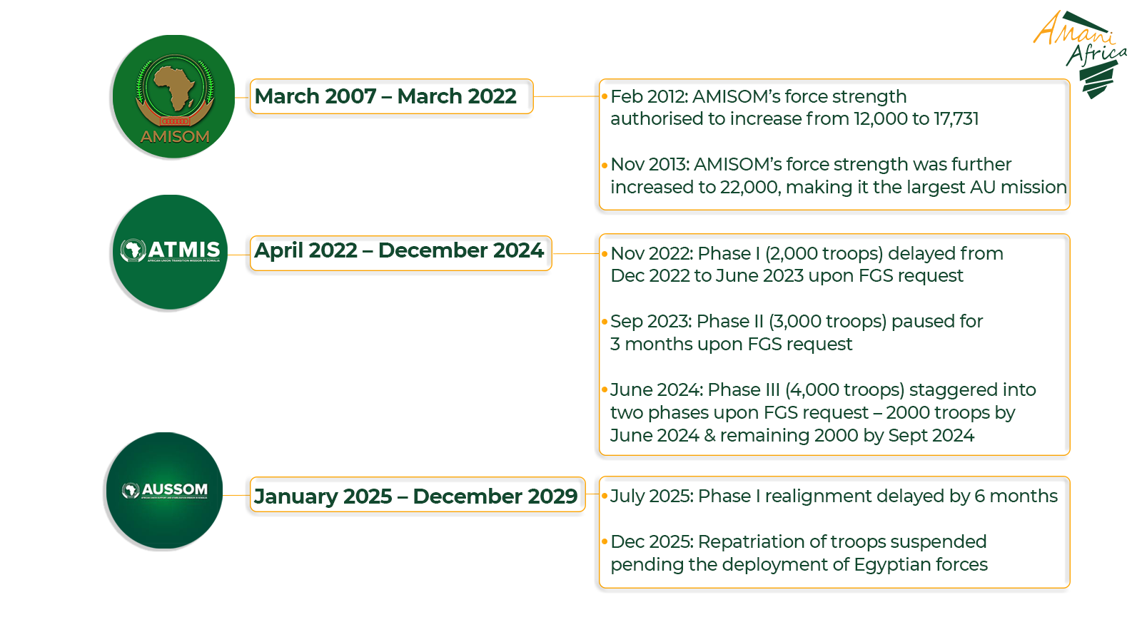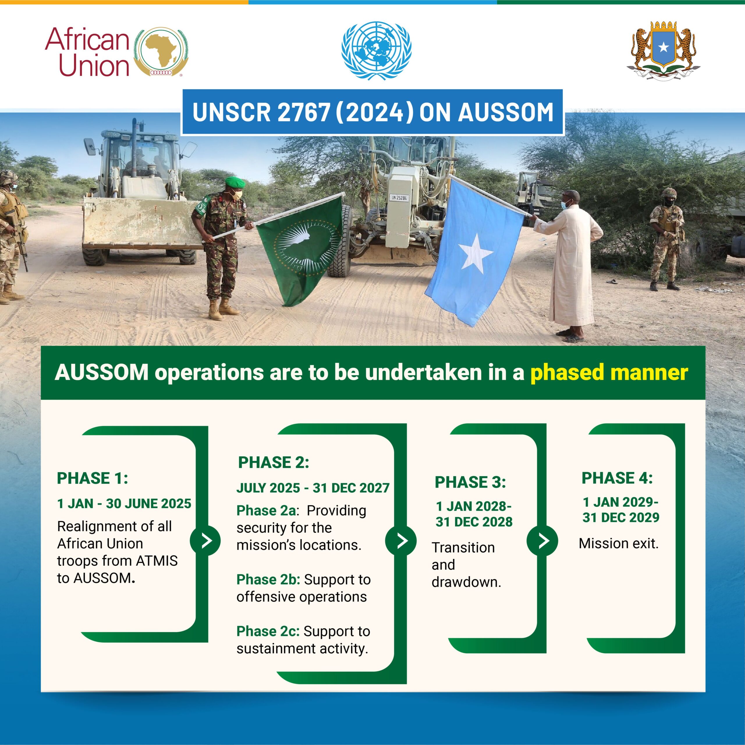 It is recalled that AUSSOM operations are to be undertaken in a four-phased approach (see below), starting from phase 1 of realignment of all AU troops from ATMIS, its predecessor, at the end of June 2025, to AUSSOM, through to phase 4, which envisages mission exit at the end of 2029. The first phase has been postponed twice by the PSC, during its 1287th and 1317th sessions, pending deployment by Egypt.