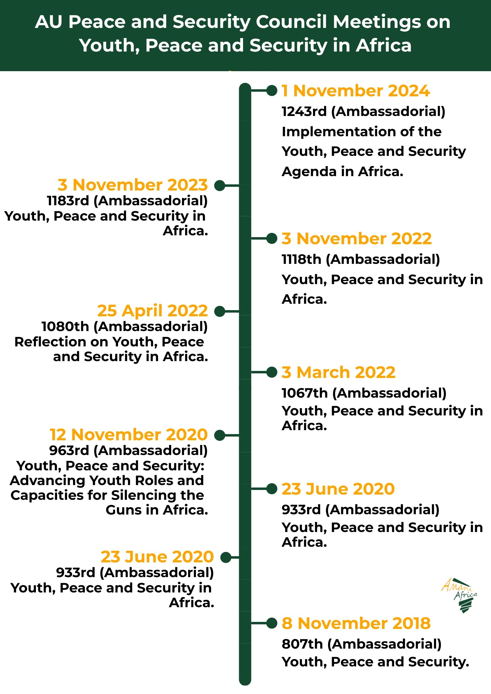 This session (which comes just a year before the African Youth Charter commemorates its 20th year, in 2026, since coming into force) will build on its previous session on YPS, held in November 2024 at PSC’s 1243rd meeting. Among others, the Council directed the AU Commission to present the draft Continental Guideline for the Development and Implementation of the National Action Plans (NAPs) on YPS to the PSC Committee of Experts for validation and, ultimately, to the Council for consideration and adoption within three months.