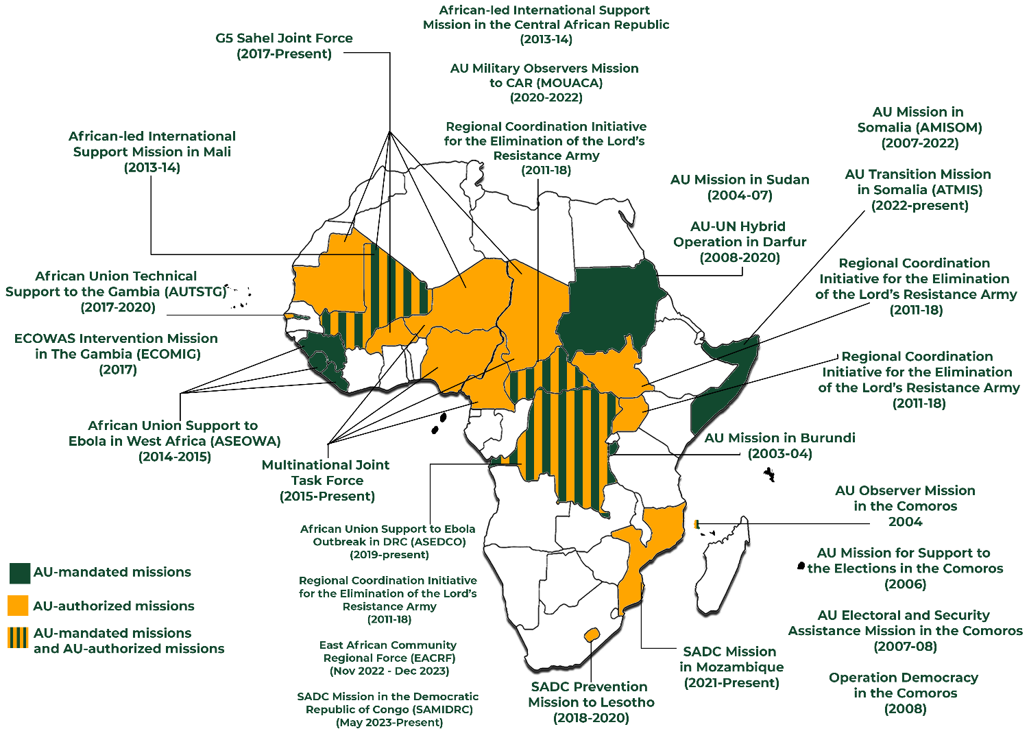 AU mandated, authorised, and endorsed PSOs (2003-2023) (Source: Amani Amani 2024 Handbook on the African Union Peace and Security Council: Guide on the Council’s Procedure, Practice and Traditions)